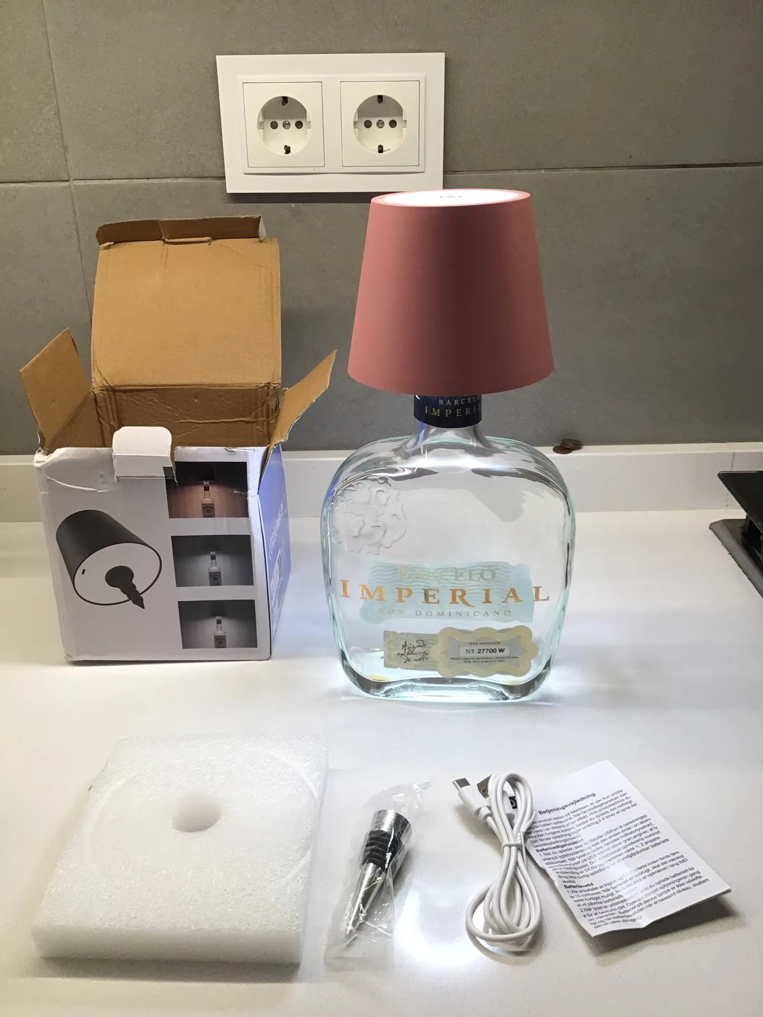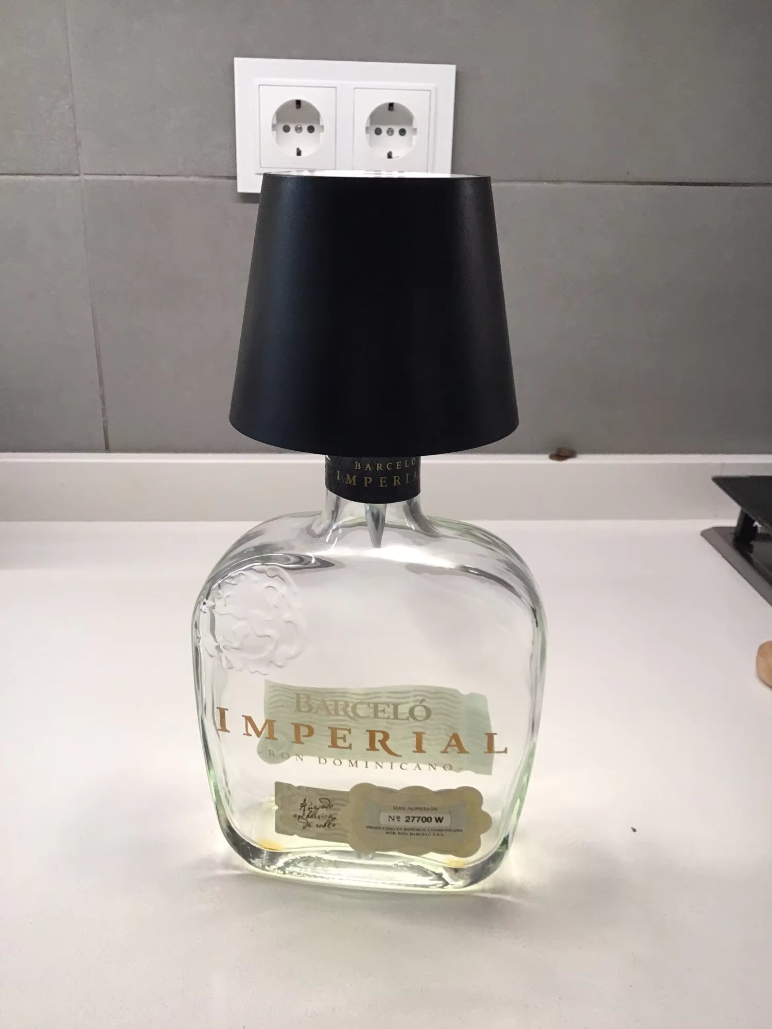 The lamp features a universal conical design that fits most standard bottles.